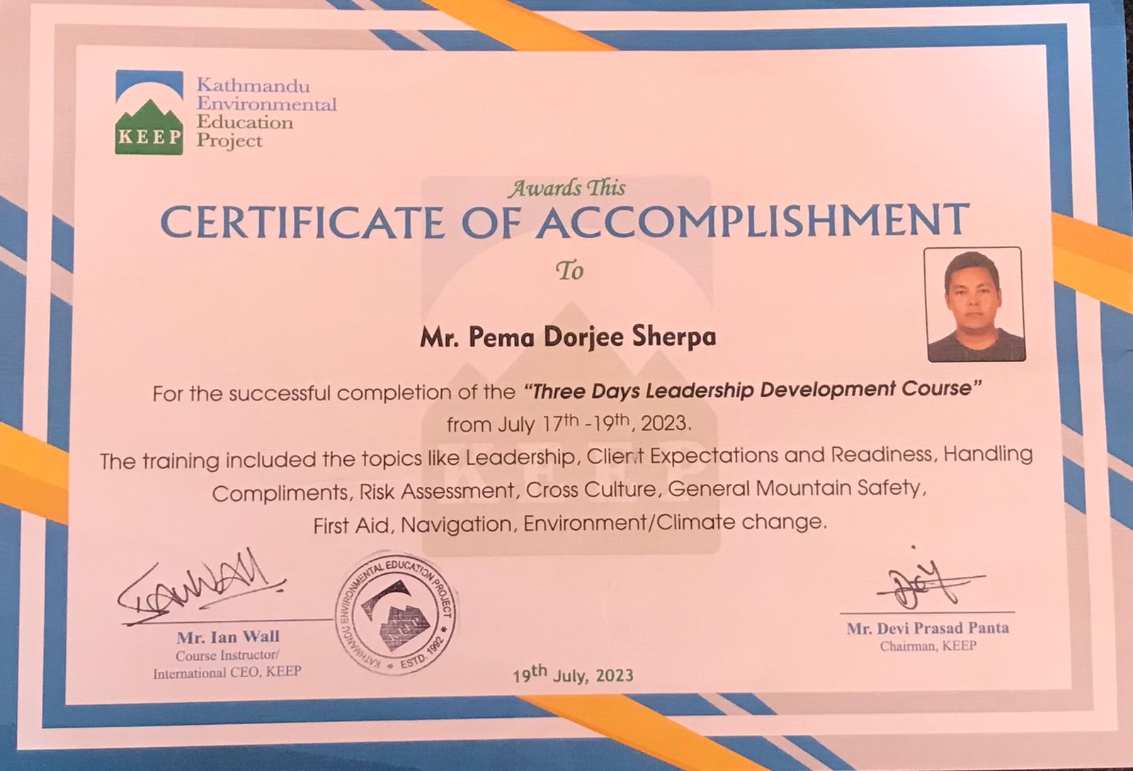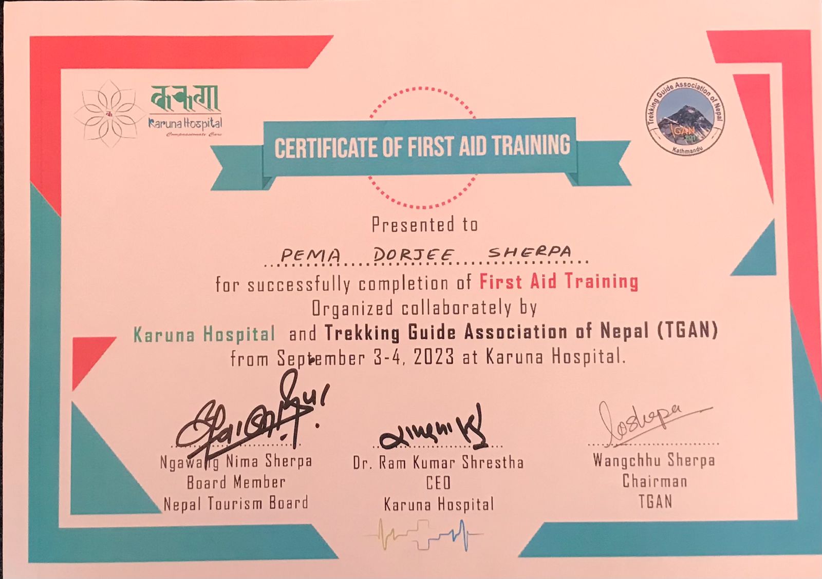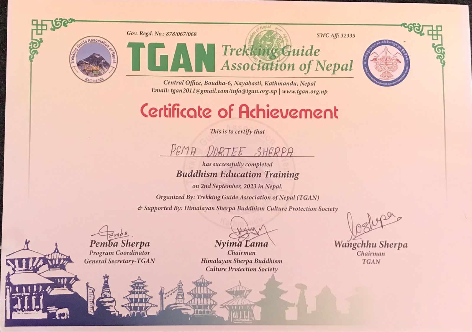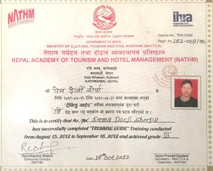 Trekking GuidePema Dorjee Sherpa is a qualified trekking guide of hill sherpa trekking, He has taken KEEP training, Nepal Academy of Tourism Board (NATHM) Guide training, First Training, Weather Forcast training, Cultural training, and he has been working as a trekking guide and safety brief guide for 15 years experience, he has been done all Everest region trek, Annapurna region Trek, Manaslu region Trek, Makalu Barun Region, Mustang region restricted area and remote valley trek Kanchenjunga, Dolpo, He loves to taking care and best motivational for his trekkers wherever they clients choose for the trekking in Nepal. and he speaks English, Hindi and Malay language so we selected as professional guide.