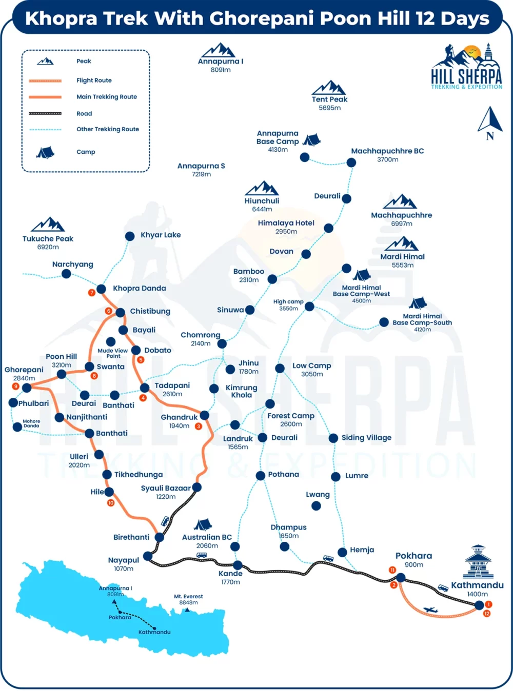 If you have already spent a lot of time in the jam-packed route of Annapurna, and want some kind of novelty, then welcome to our Khopra Trek With Ghorepani Poon Hill 12 days tour. This Khopra trek will take you on a fascinating journey into the world of untouched nature, unique landscapes, and a completely safe route.